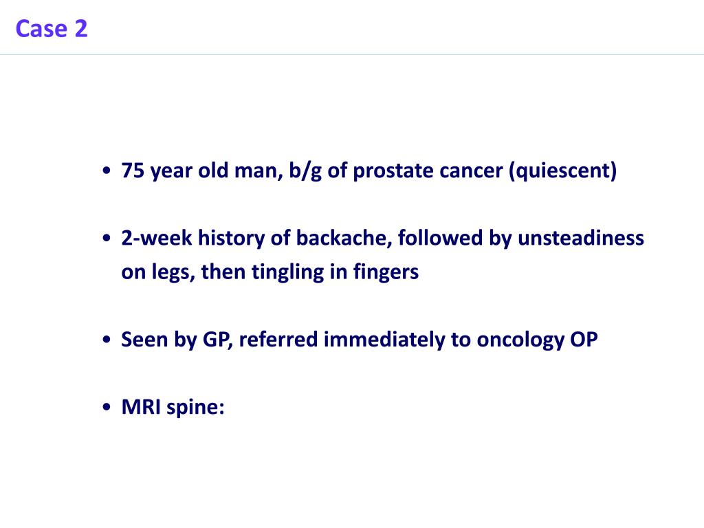 Case 2 • 75 year old man, b/g of prostate cancer (quiescent) • 2-week history of backache, followed by unsteadiness on legs, then tingling in fingers • Seen by GP, referred immediately to oncology OP • MRI spine: