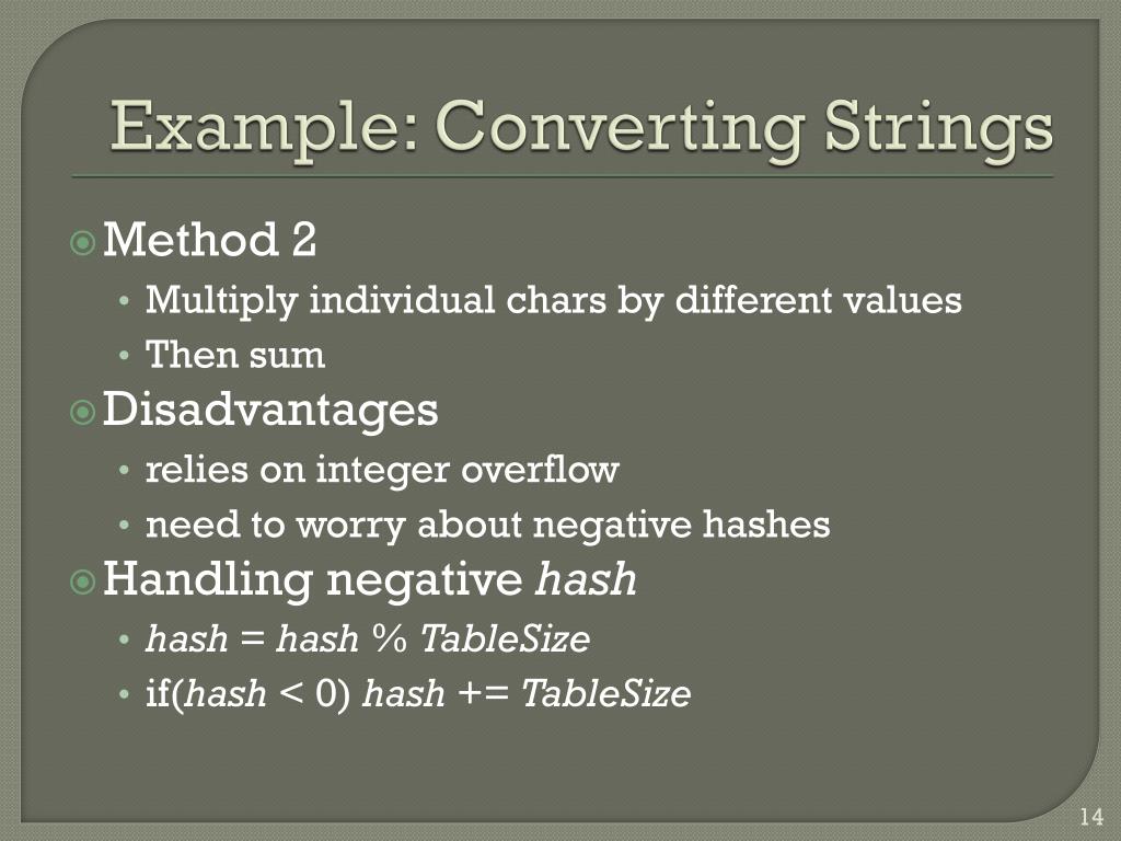 Example: Converting Strings • Method 1 • convert each char to an int • sum them • return sum % TableSize • Advantages • simple • time is O(key length)