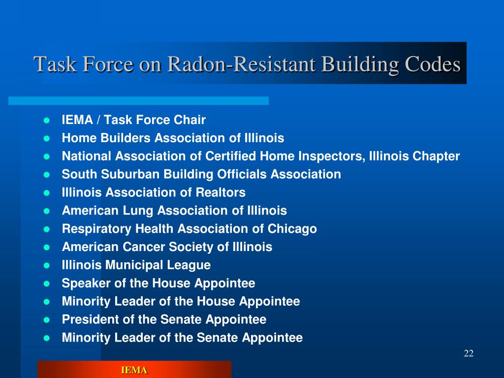 Task Force on Radon-Resistant Building Codes • IEMA / Task Force Chair • Home Builders Association of Illinois • National Association of Certified Home Inspectors, Illinois Chapter • South Suburban Building Officials Association • Illinois Association of Realtors • American Lung Association of Illinois • Respiratory Health Association of Chicago • American Cancer Society of Illinois • Illinois Municipal League • Speaker of the House Appointee • Minority Leader of the House Appointee • President of the Senate Appointee • Minority Leader of the Senate Appointee