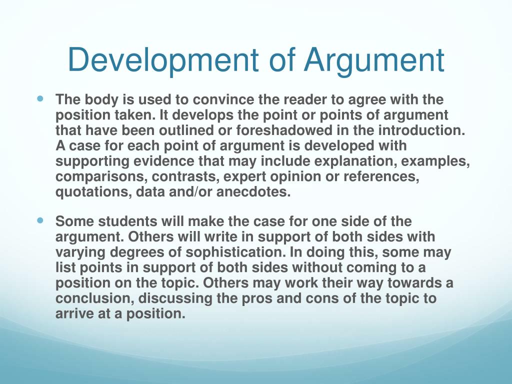 Development of Argument • The body is used to convince the reader to agree with the position taken. It develops the point or points of argument that have been outlined or foreshadowed in the introduction. A case for each point of argument is developed with supporting evidence that may include explanation, examples, comparisons, contrasts, expert opinion or references, quotations, data and/or anecdotes. • Some students will make the case for one side of the argument. Others will write in support of both sides with varying degrees of sophistication. In doing this, some may list points in support of both sides without coming to a position on the topic. Others may work their way towards a conclusion, discussing the pros and cons of the topic to arrive at a position.