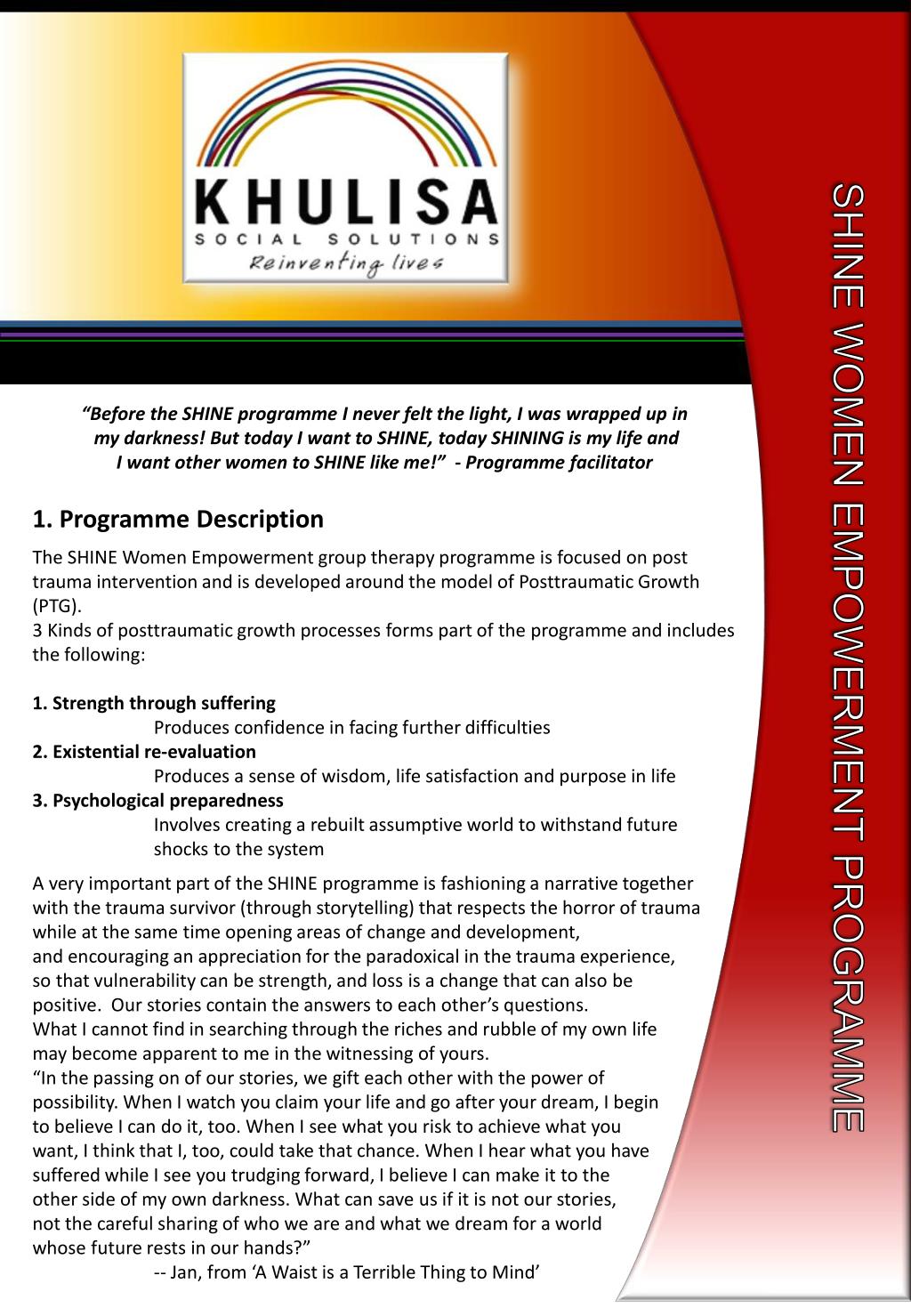 “Before the SHINE programme I never felt the light, I was wrapped up in my darkness! But today I want to SHINE, today SHINING is my life and I want other women to SHINE like me!” - Programmefacilitator 1. Programme Description The SHINE Women Empowerment group therapy programme is focused on post trauma intervention and is developed around the model of Posttraumatic Growth (PTG). 3 Kinds of posttraumatic growth processes forms part of the programme and includes the following: 1. Strength through suffering Produces confidence in facing further difficulties 2. Existential re-evaluation Produces a sense of wisdom, life satisfaction and purpose in life 3. Psychological preparedness Involves creating a rebuilt assumptive world to withstand future shocks to the system A very important part of the SHINE programme is fashioning a narrative together with the trauma survivor (through storytelling) that respects the horror of trauma while at the same time opening areas of change and development, and encouraging an appreciation for the paradoxical in the trauma experience, so that vulnerability can be strength, and loss is a change that can also be positive. Our stories contain the answers to each other’s questions. What I cannot find in searching through the riches and rubble of my own life may become apparent to me in the witnessing of yours. “In the passing on of our stories, we gift each other with the power of possibility. When I watch you claim your life and go after your dream, I begin to believe I can do it, too. When I see what you risk to achieve what you want, I think that I, too, could take that chance. When I hear what you have suffered while I see you trudging forward, I believe I can make it to the other side of my own darkness. What can save us if it is not our stories, not the careful sharing of who we are and what we dream for a world whose future rests in our hands?” -- Jan, from ‘A Waist is a Terrible Thing to Mind’ SHINE WOMEN EMPOWERMENT PROGRAMME