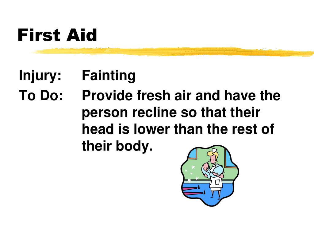 Injury: Fainting To Do: Provide fresh air and have the person recline so that their head is lower than the rest of their body. First Aid