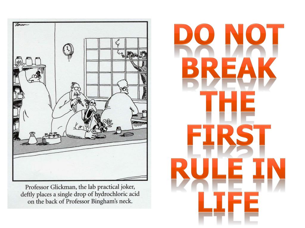 1. Listen to or read instructions carefully before attempting to do anything. 2. Wear safety goggles to protect your eyes from chemicals, heated materials, or things that might be able to shatter. 3. Notify your teacher if any spills or accidents occur. A. General Safety Rules