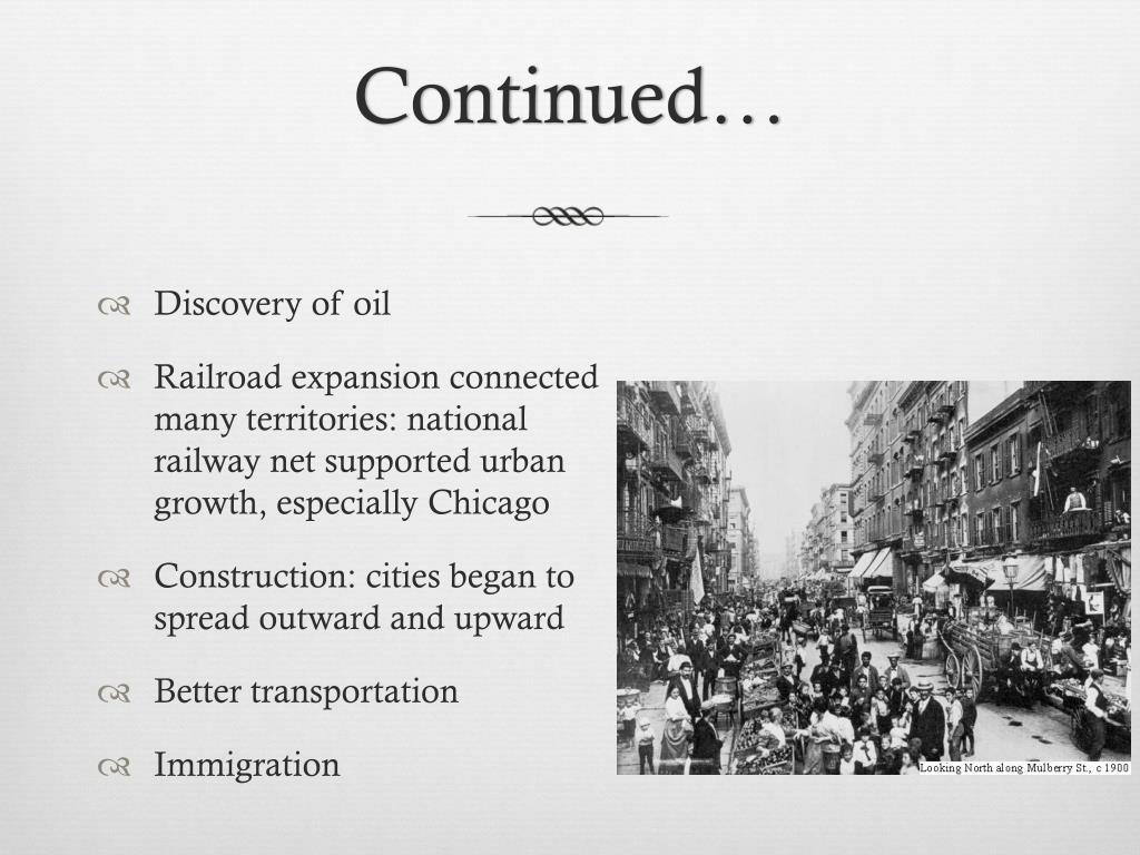 Continued… Discovery of oil Railroad expansion connected many territories: national railway net supported urban growth, especially Chicago Construction: cities began to spread outward and upward Better transportation Immigration