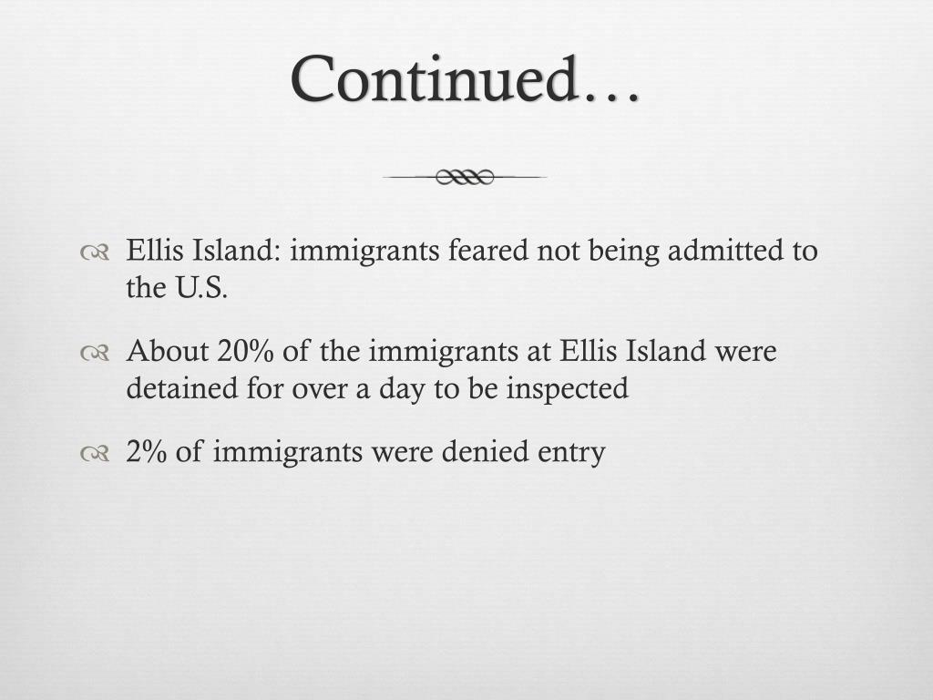 Continued… Ellis Island: immigrants feared not being admitted to the U.S. About 20% of the immigrants at Ellis Island were detained for over a day to be inspected 2% of immigrants were denied entry
