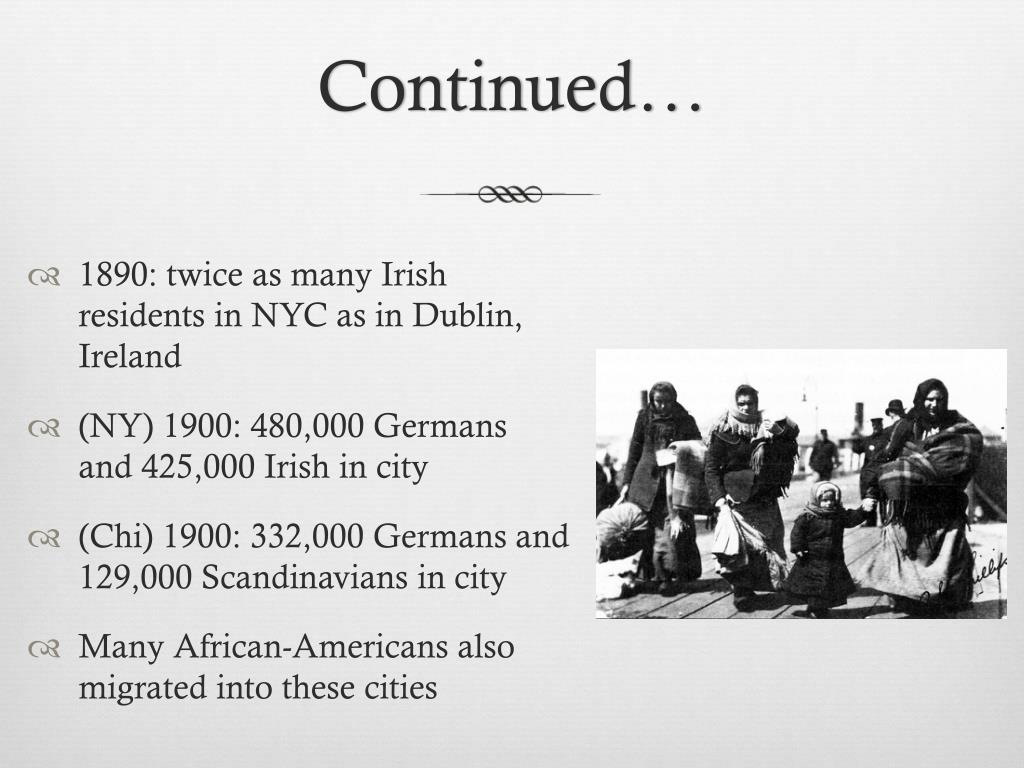 Continued… 1890: twice as many Irish residents in NYC as in Dublin, Ireland (NY) 1900: 480,000 Germans and 425,000 Irish in city (Chi) 1900: 332,000 Germans and 129,000 Scandinavians in city Many African-Americans also migrated into these cities