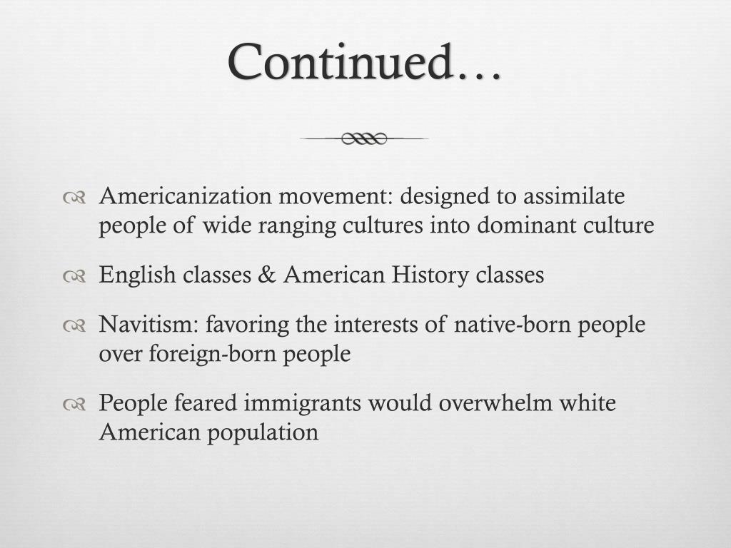 Continued… Americanization movement: designed to assimilate people of wide ranging cultures into dominant culture English classes & American History classes Navitism: favoring the interests of native-born people over foreign-born people People feared immigrants would overwhelm white American population
