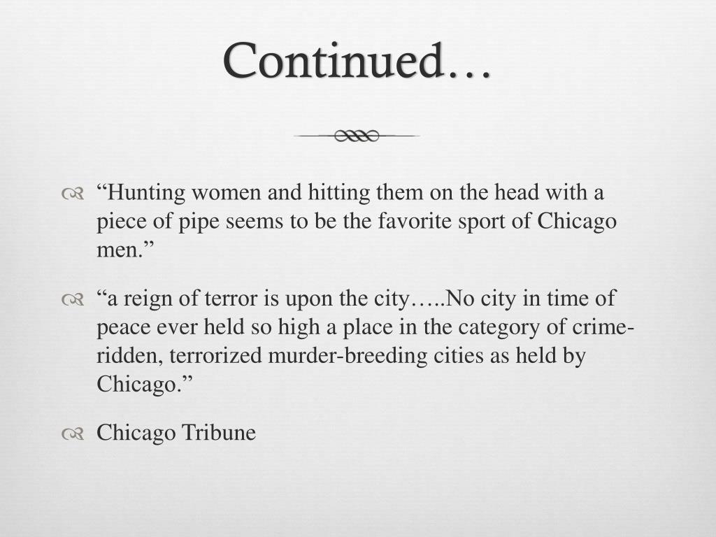 Continued… “Hunting women and hitting them on the head with a piece of pipe seems to be the favorite sport of Chicago men.” “a reign of terror is upon the city…..No city in time of peace ever held so high a place in the category of crime-ridden, terrorized murder-breeding cities as held by Chicago.” Chicago Tribune