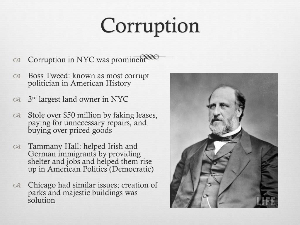 Corruption Corruption in NYC was prominent Boss Tweed: known as most corrupt politician in American History 3rd largest land owner in NYC Stole over $50 million by faking leases, paying for unnecessary repairs, and buying over priced goods Tammany Hall: helped Irish and German immigrants by providing shelter and jobs and helped them rise up in American Politics (Democratic) Chicago had similar issues; creation of parks and majestic buildings was solution