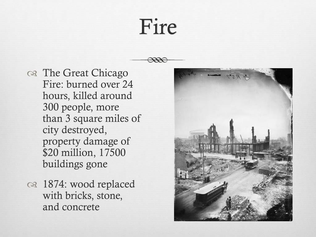 Fire The Great Chicago Fire: burned over 24 hours, killed around 300 people, more than 3 square miles of city destroyed, property damage of $20 million, 17500 buildings gone 1874: wood replaced with bricks, stone, and concrete