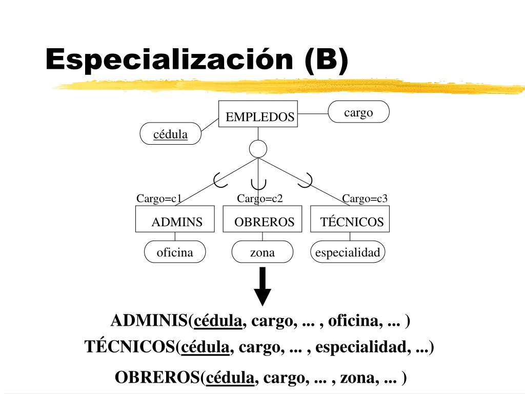 cargo EMPLEDOS cédula Cargo=c1 Cargo=c2 Cargo=c3 oficina zona especialidad ADMINS OBREROS TÉCNICOS ADMINIS(cédula, cargo, ... , oficina, ... ) TÉCNICOS(cédula, cargo, ... , especialidad, ...) OBREROS(cédula, cargo, ... , zona, ... ) Especialización (B)