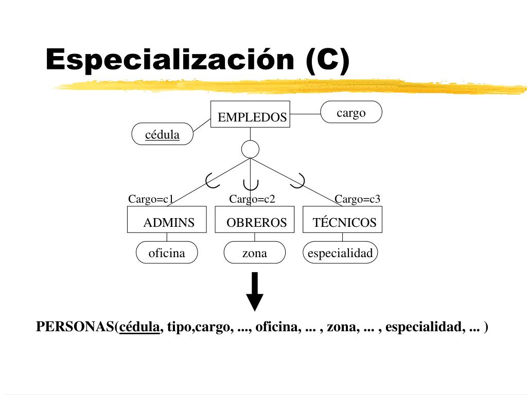 cargo EMPLEDOS cédula Cargo=c1 Cargo=c2 Cargo=c3 oficina zona especialidad ADMINS OBREROS TÉCNICOS Especialización (C) PERSONAS(cédula, tipo,cargo, ..., oficina, ... , zona, ... , especialidad, ... )