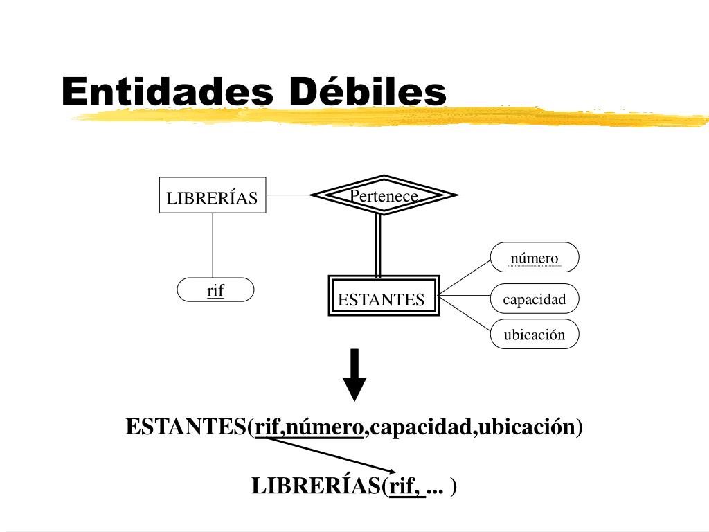 LIBRERÍAS ESTANTES Entidades Débiles Pertenece número rif capacidad ubicación ESTANTES(rif,número,capacidad,ubicación) LIBRERÍAS(rif, ... )