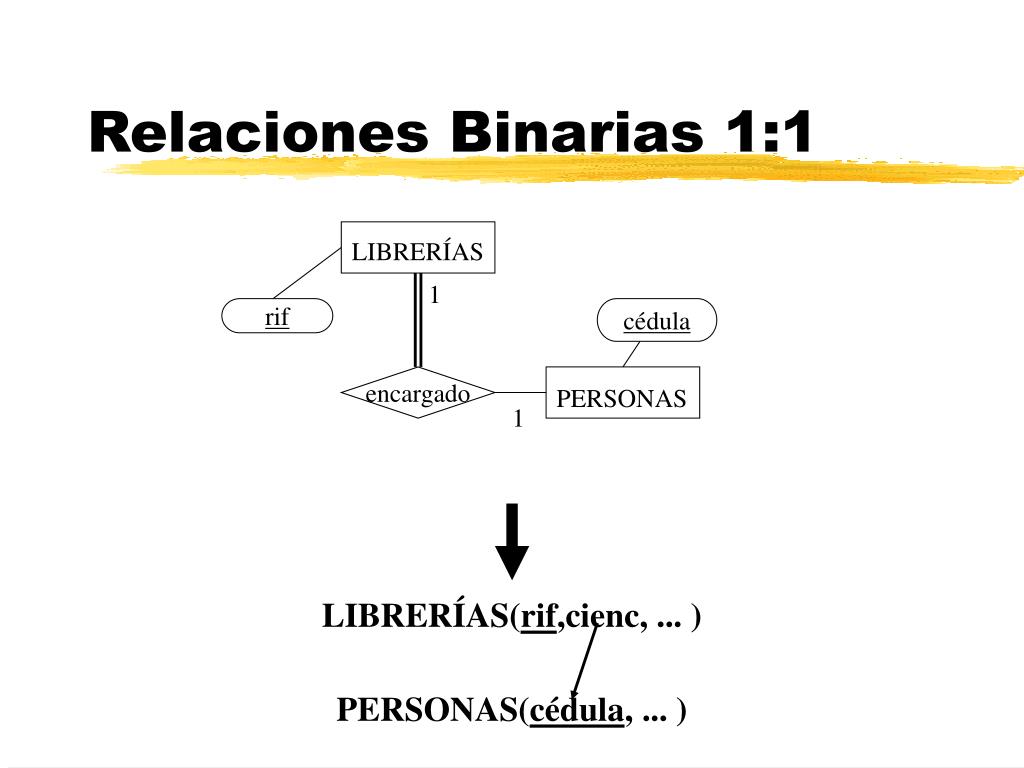 LIBRERÍAS PERSONAS Relaciones Binarias 1:1 1 rif cédula encargado 1 LIBRERÍAS(rif,cienc, ... ) PERSONAS(cédula, ... )