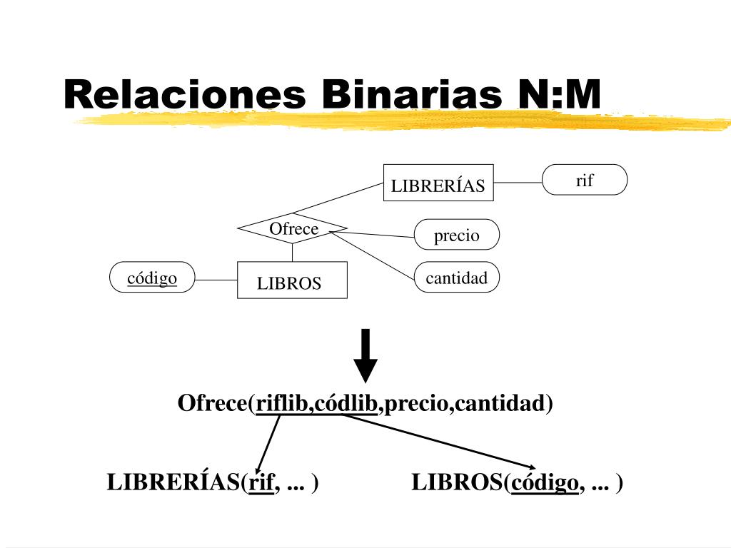 LIBRERÍAS Ofrece LIBROS Relaciones Binarias N:M rif precio código cantidad Ofrece(riflib,códlib,precio,cantidad) LIBRERÍAS(rif, ... ) LIBROS(código, ... )