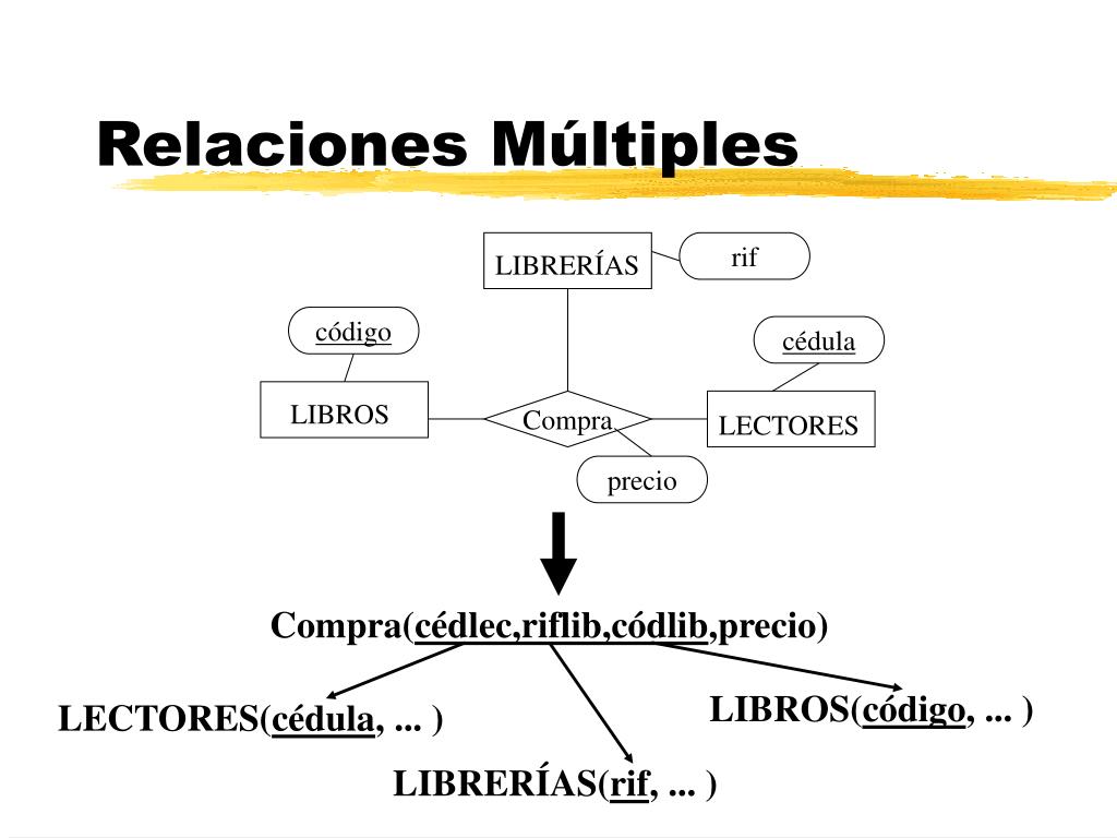 LIBRERÍAS LIBROS LECTORES Relaciones Múltiples rif código cédula Compra precio Compra(cédlec,riflib,códlib,precio) LIBROS(código, ... ) LECTORES(cédula, ... ) LIBRERÍAS(rif, ... )