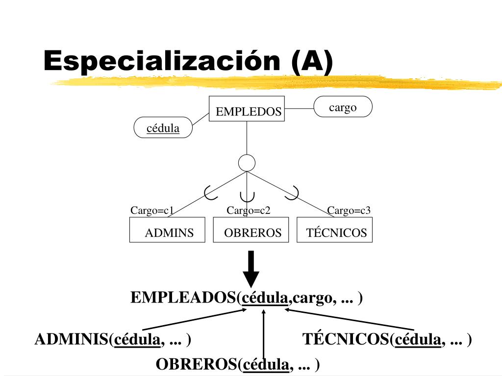 cargo EMPLEDOS cédula Cargo=c1 Cargo=c2 Cargo=c3 TÉCNICOS OBREROS ADMINS EMPLEADOS(cédula,cargo, ... ) ADMINIS(cédula, ... ) TÉCNICOS(cédula, ... ) OBREROS(cédula, ... ) Especialización (A)