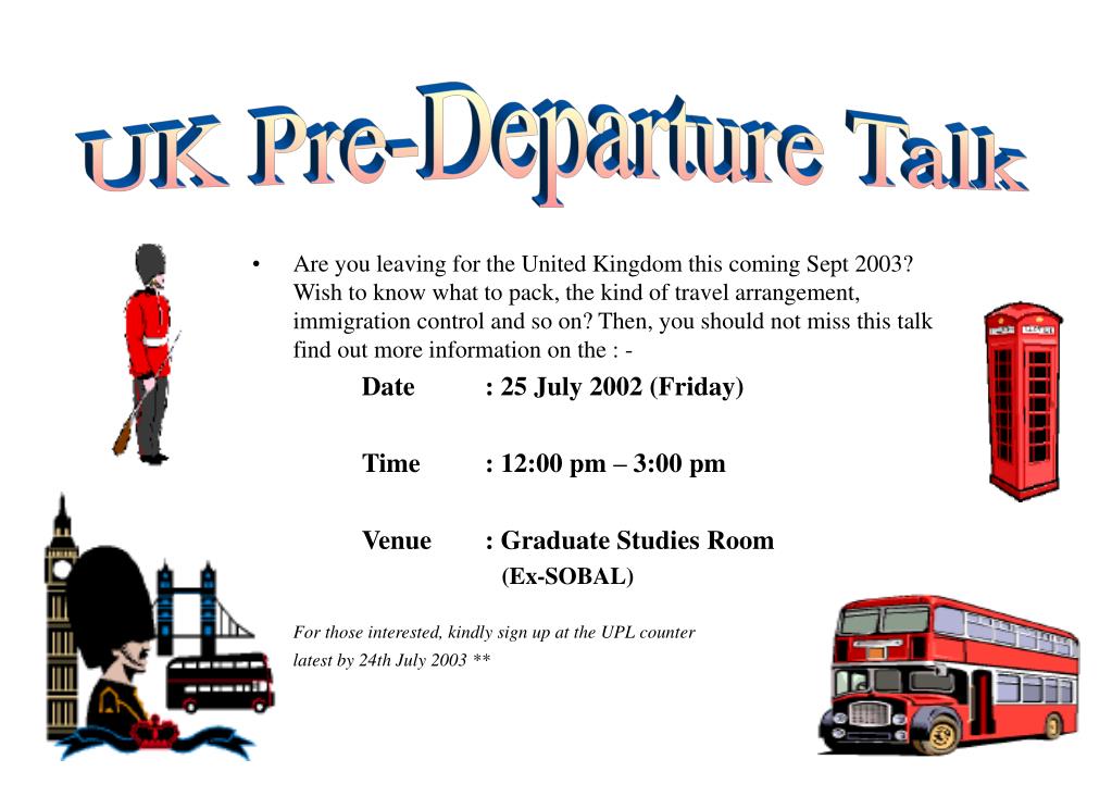 UK Pre-Departure Talk • Are you leaving for the United Kingdom this coming Sept 2003? Wish to know what to pack, the kind of travel arrangement, immigration control and so on? Then, you should not miss this talk to find out more information on the : - Date : 25 July 2002 (Friday) Time : 12:00 pm – 3:00 pm Venue : Graduate Studies Room (Ex-SOBAL) ** For those interested, kindly sign up at the UPL counter latest by 24th July 2003 **
