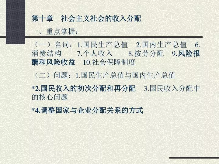 第十章 社会主义社会的收入分配 一、重点掌握: (一)名词:1.国民生产总值 2.国内生产总值 6.消费结构 7.个人收入 8.按劳分配 9.风险报酬和风险收益10.社会保障制度 (二)问题:1.国民生产总值与国内生产总值 *2.国民收入的初次分配和再分配 3.国民收入分配中的核心问题 *4.调整国家与企业分配关系的方式