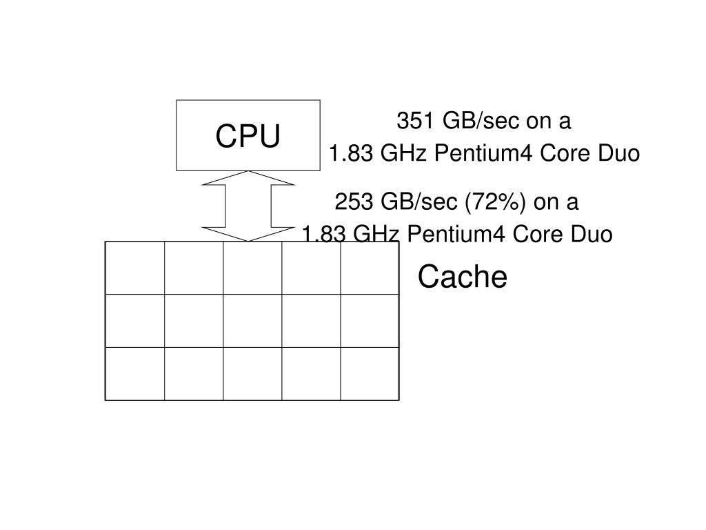 CPU 351 GB/sec on a 1.83 GHz Pentium4 Core Duo 253 GB/sec (72%) on a 1.83 GHz Pentium4 Core Duo Cache