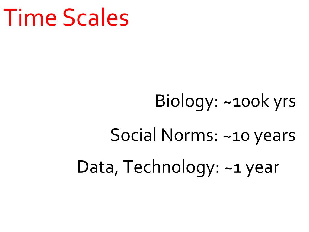 Time Scales Biology: ~100k yrs Social Norms: ~10 years Data, Technology: ~1year