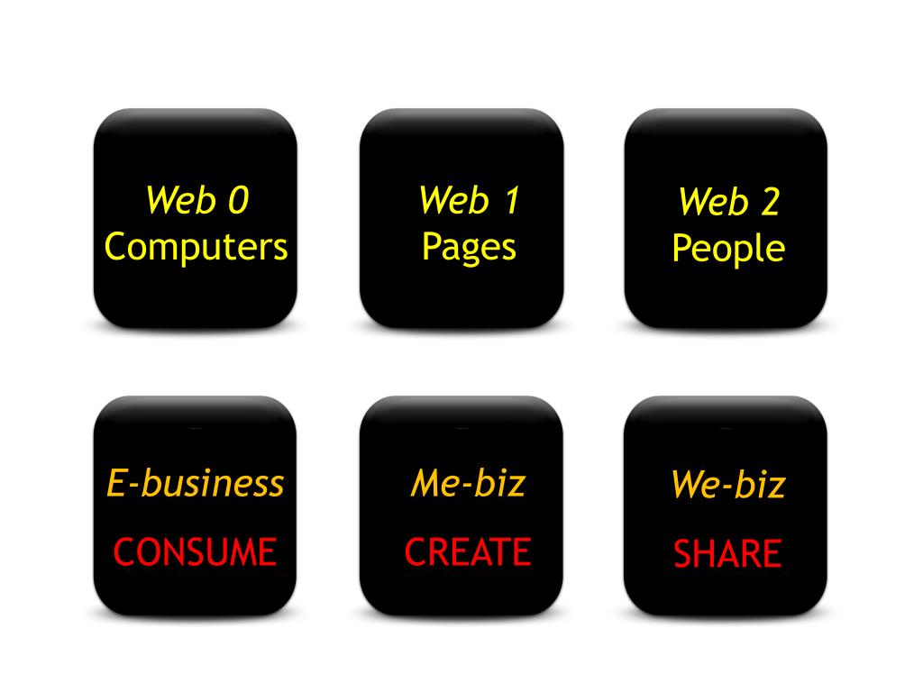 Web 0 Computers Web 0 Computers Web 1Pages Web 2People E-business CONSUME Me-biz CREATE We-biz SHARE