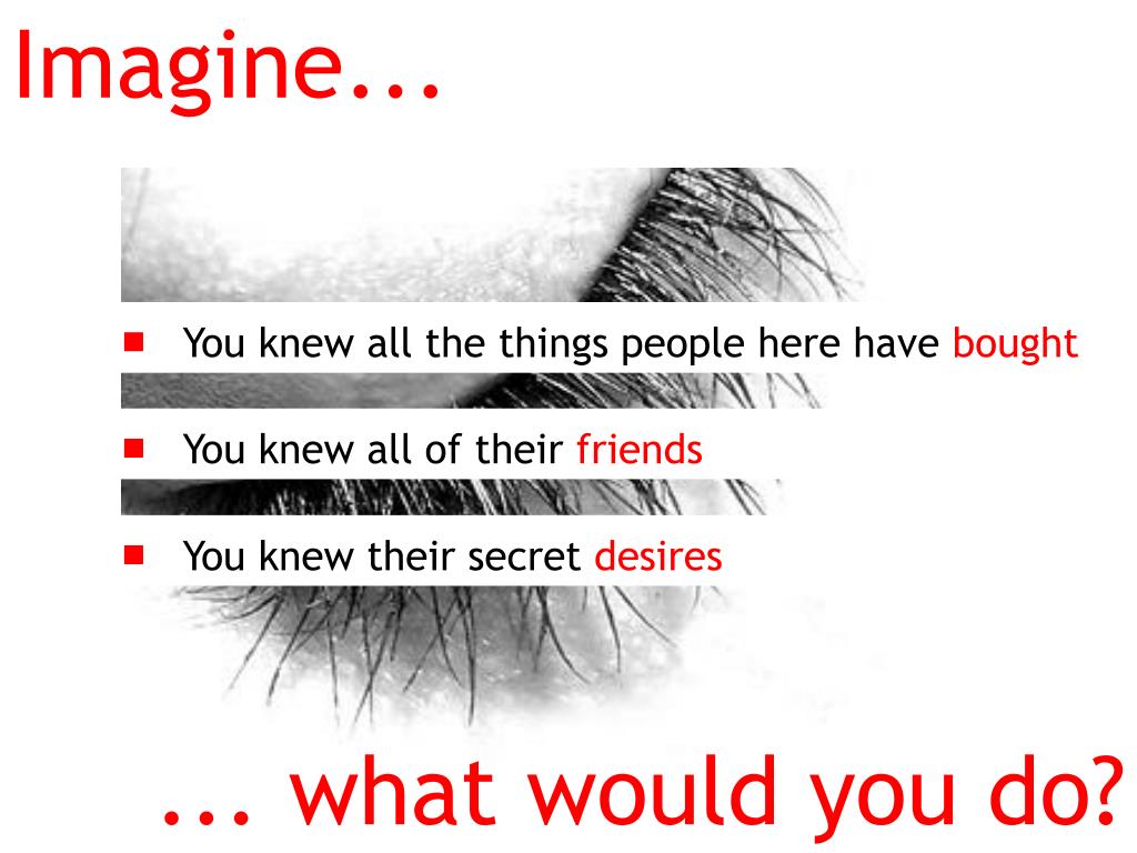 Imagine... • You knew all the things people here have bought • You knew all of their friends • You knew their secret desires ... what would you do?