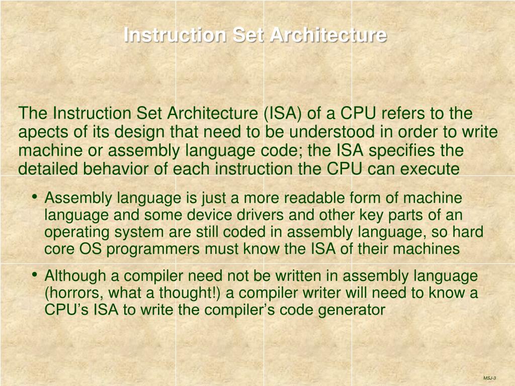 The Instruction Set Architecture (ISA) of a CPU refers to the apects of its design that need to be understood in order to write machine or assembly language code; the ISA specifies the detailed behavior of each instruction the CPU can execute Assembly language is just a more readable form of machine language and some device drivers and other key parts of an operating system are still coded in assembly language, so hard core OS programmers must know the ISA of their machines Although a compiler need not be written in assembly language (horrors, what a thought!) a compiler writer will need to know a CPU’s ISA to write the compiler’s code generator Instruction Set Architecture