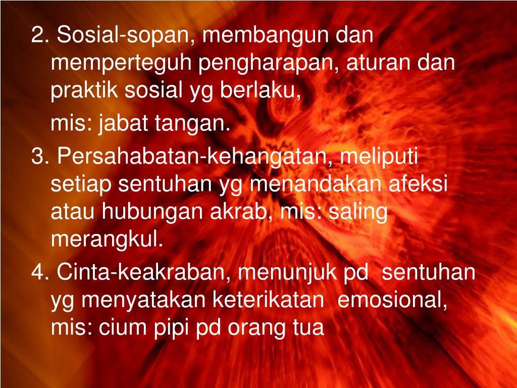2. Sosial-sopan, membangundanmemperteguhpengharapan, aturandanpraktiksosialygberlaku, mis: jabattangan. 3. Persahabatan-kehangatan, meliputisetiapsentuhanygmenandakanafeksiatauhubunganakrab, mis: salingmerangkul. 4. Cinta-keakraban, menunjuk pd sentuhanygmenyatakanketerikatanemosional, mis: ciumpipi pd orangtua