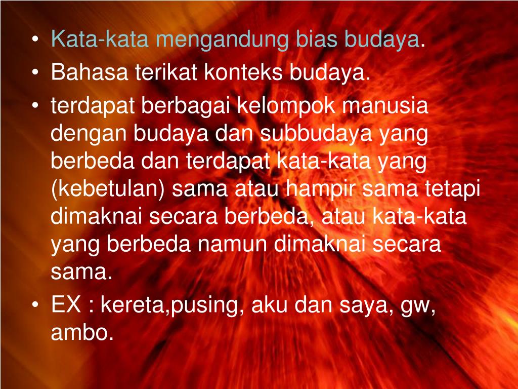 Kata-katamengandung bias budaya. • Bahasaterikatkonteksbudaya. • terdapatberbagaikelompokmanusiadenganbudayadansubbudaya yang berbedadanterdapatkata-kata yang (kebetulan) samaatauhampirsamatetapidimaknaisecaraberbeda, ataukata-kata yang berbedanamundimaknaisecarasama. • EX : kereta,pusing, akudansaya, gw, ambo.