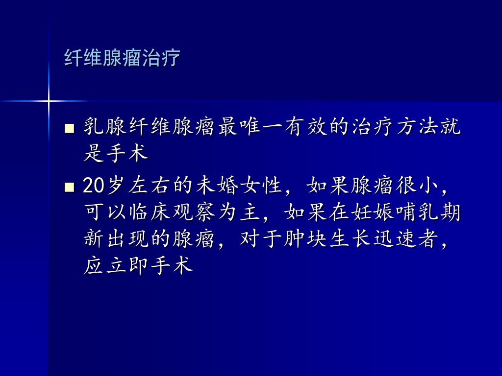 纤维腺瘤治疗 • 乳腺纤维腺瘤最唯一有效的治疗方法就是手术 • 20岁左右的未婚女性,如果腺瘤很小,可以临床观察为主,如果在妊娠哺乳期新出现的腺瘤,对于肿块生长迅速者,应立即手术