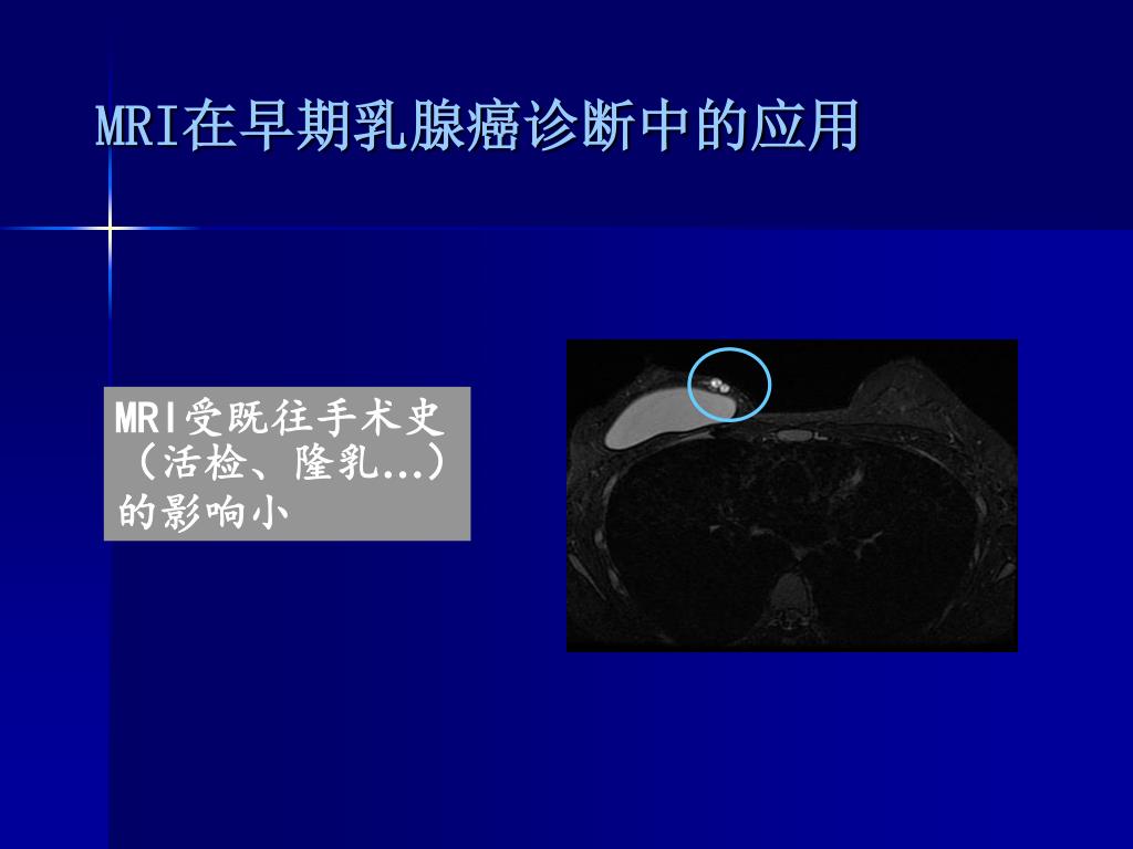 MRI在早期乳腺癌诊断中的应用 MRI受既往手术史(活检、隆乳…)的影响小