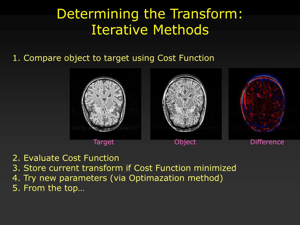 Determining the Transform:Iterative Methods 1. Compare object to target using Cost Function 2. Evaluate Cost Function 3. Store current transform if Cost Function minimized 4. Try new parameters (via Optimazation method) 5. From the top… Target Object Difference