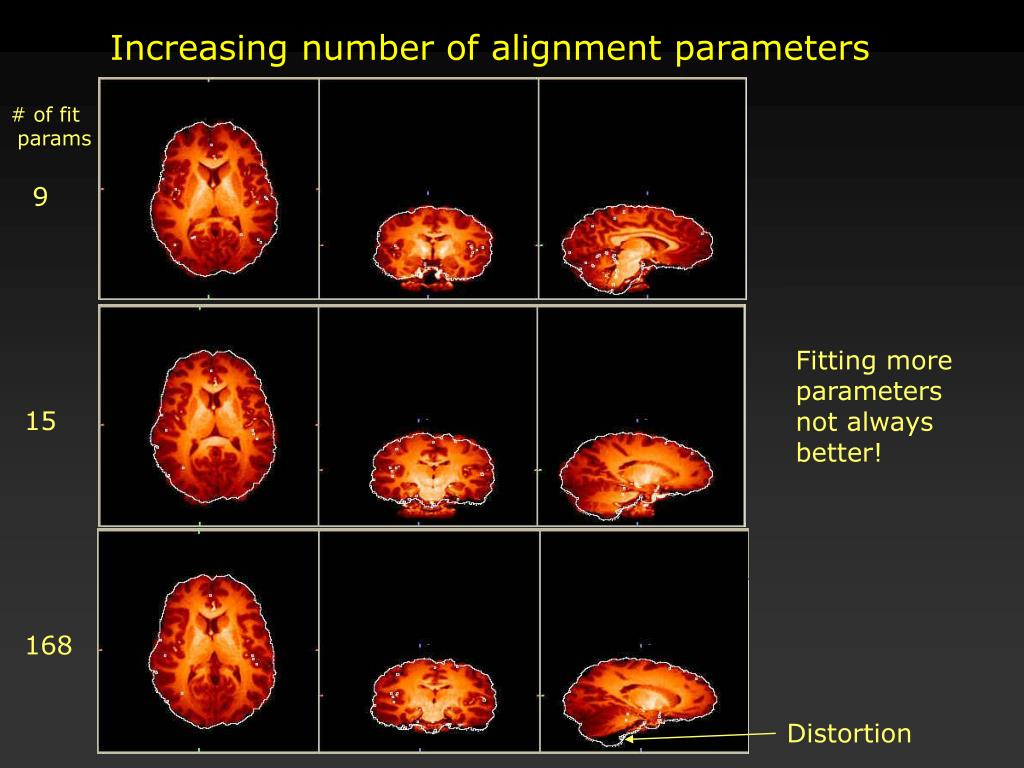 More is not always better! Only use as many parameters as you need. If you ask for more parameters to be fit, they will be used, at the expense of the correct parameters. Spatial Transform Models Name Parameters Rigid-body 6: translation + rotation Global rescaling 7: trans + rot + zoom (xyz locked) Traditional 9: trans + rot + zoom Affine 12: trans + rot + zoom + perspective