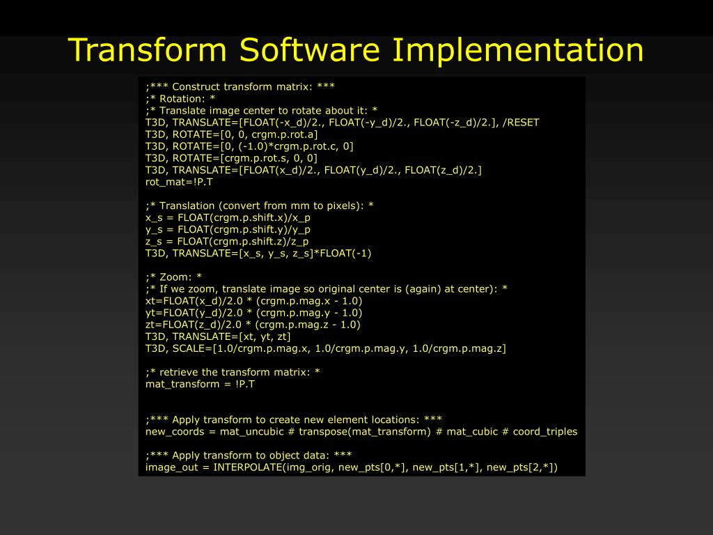 Transform Software Implementation ;*** Construct transform matrix: *** ;* Rotation: * ;* Translate image center to rotate about it: * T3D, TRANSLATE=[FLOAT(-x_d)/2., FLOAT(-y_d)/2., FLOAT(-z_d)/2.], /RESET T3D, ROTATE=[0, 0, crgm.p.rot.a] T3D, ROTATE=[0, (-1.0)*crgm.p.rot.c, 0] T3D, ROTATE=[crgm.p.rot.s, 0, 0] T3D, TRANSLATE=[FLOAT(x_d)/2., FLOAT(y_d)/2., FLOAT(z_d)/2.] rot_mat=!P.T ;* Translation (convert from mm to pixels): * x_s = FLOAT(crgm.p.shift.x)/x_p y_s = FLOAT(crgm.p.shift.y)/y_p z_s = FLOAT(crgm.p.shift.z)/z_p T3D, TRANSLATE=[x_s, y_s, z_s]*FLOAT(-1) ;* Zoom: * ;* If we zoom, translate image so original center is (again) at center): * xt=FLOAT(x_d)/2.0 * (crgm.p.mag.x - 1.0) yt=FLOAT(y_d)/2.0 * (crgm.p.mag.y - 1.0) zt=FLOAT(z_d)/2.0 * (crgm.p.mag.z - 1.0) T3D, TRANSLATE=[xt, yt, zt] T3D, SCALE=[1.0/crgm.p.mag.x, 1.0/crgm.p.mag.y, 1.0/crgm.p.mag.z] ;* retrieve the transform matrix: * mat_transform = !P.T ;*** Apply transform to create new element locations: *** new_coords = mat_uncubic # transpose(mat_transform) # mat_cubic # coord_triples ;*** Apply transform to object data: *** image_out = INTERPOLATE(img_orig, new_pts[0,*], new_pts[1,*], new_pts[2,*])