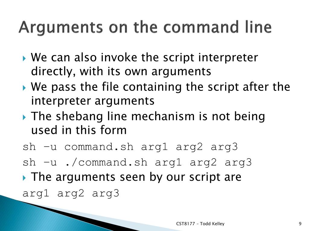 Arguments on the command line • We can also invoke the script interpreter directly, with its own arguments • We pass the file containing the script after the interpreter arguments • The shebang line mechanism is not being used in this form sh–u command.sh arg1 arg2 arg3 sh –u ./command.sh arg1 arg2 arg3 • The arguments seen by our script are arg1 arg2 arg3 CST8177 – Todd Kelley