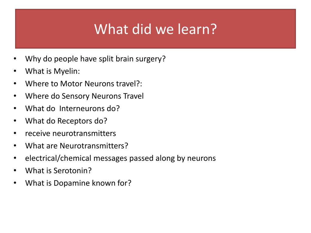 What did we learn? • Why do people have split brain surgery? • What is Myelin: • Where to Motor Neurons travel?: • Where do Sensory Neurons Travel • What do Interneurons do? • What do Receptors do? • receive neurotransmitters • What are Neurotransmitters? • electrical/chemical messages passed along by neurons • What is Serotonin? • What is Dopamine known for?