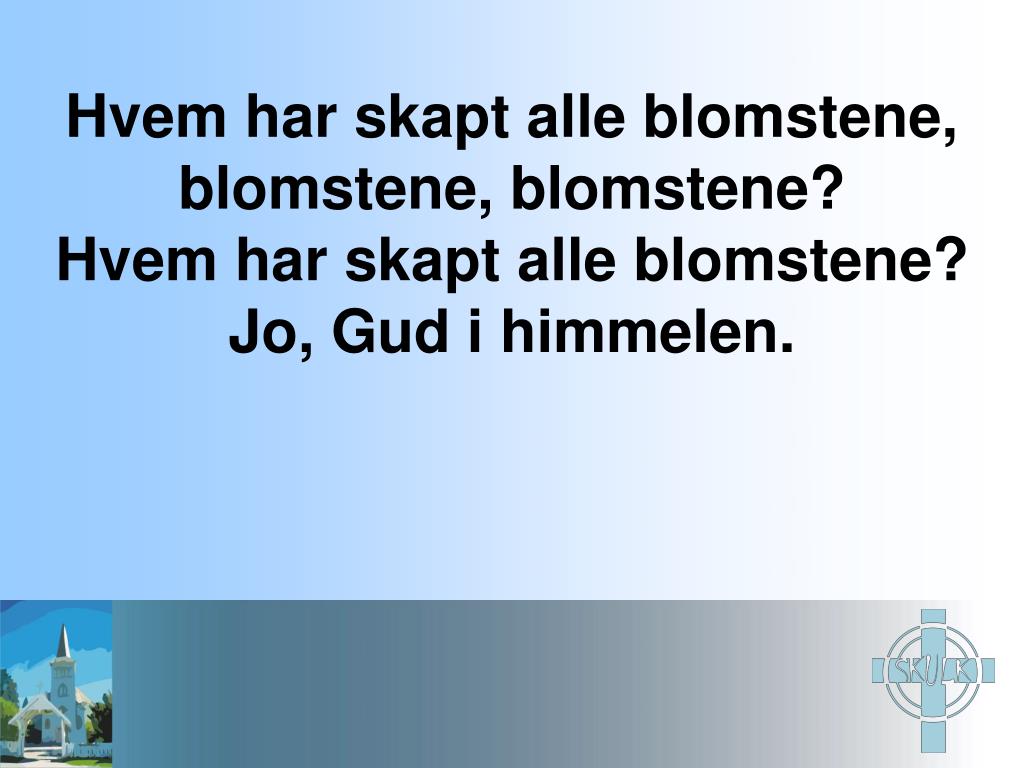 Hvem har skapt alle blomstene, blomstene, blomstene? Hvem har skapt alle blomstene? Jo, Gud i himmelen.