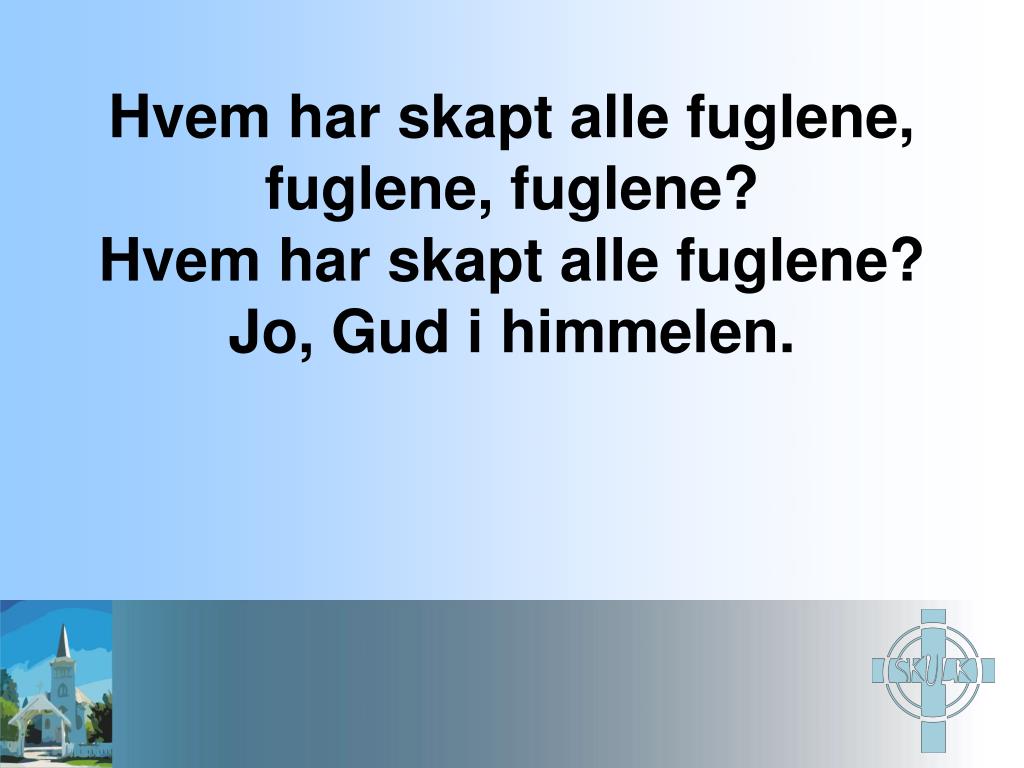 Hvem har skapt alle fuglene, fuglene, fuglene? Hvem har skapt alle fuglene? Jo, Gud i himmelen.