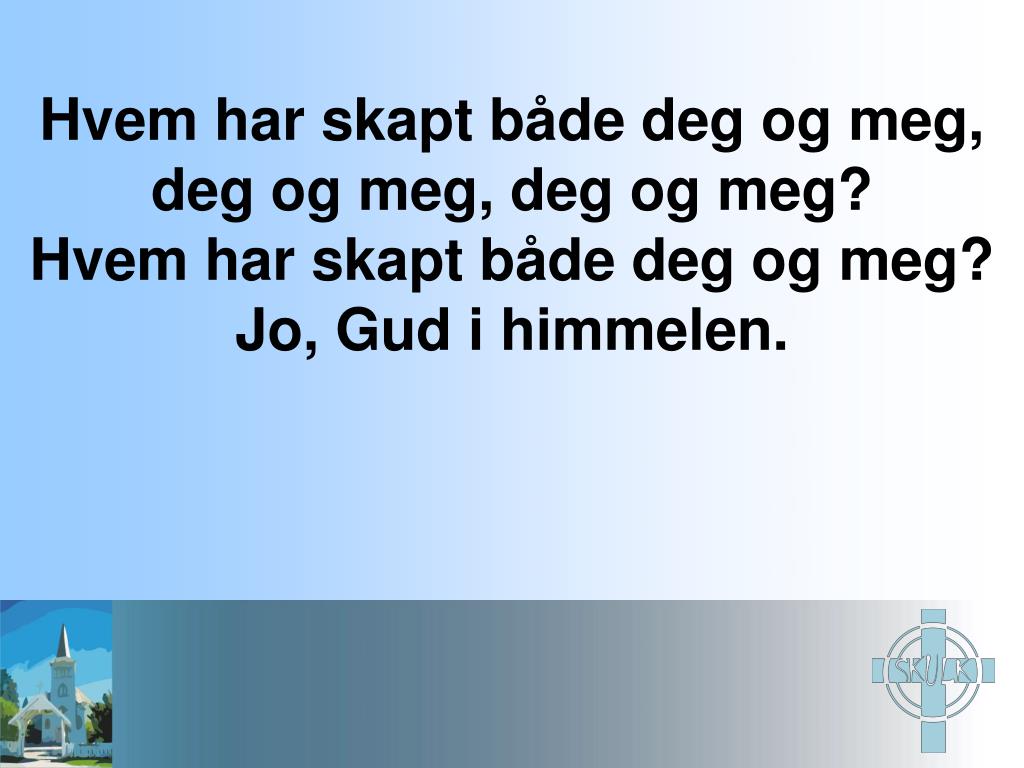 Hvem har skapt både deg og meg, deg og meg, deg og meg? Hvem har skapt både deg og meg? Jo, Gud i himmelen.