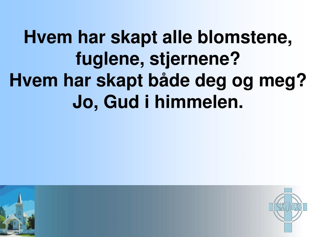 Hvem har skapt alle blomstene, fuglene, stjernene? Hvem har skapt både deg og meg? Jo, Gud i himmelen.