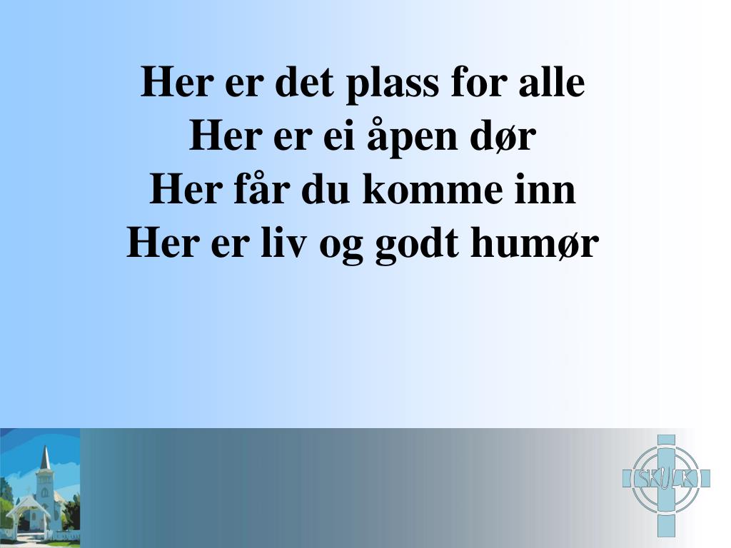 Her er det plass for alle Her er ei åpen dør Her får du komme inn Her er liv og godt humør