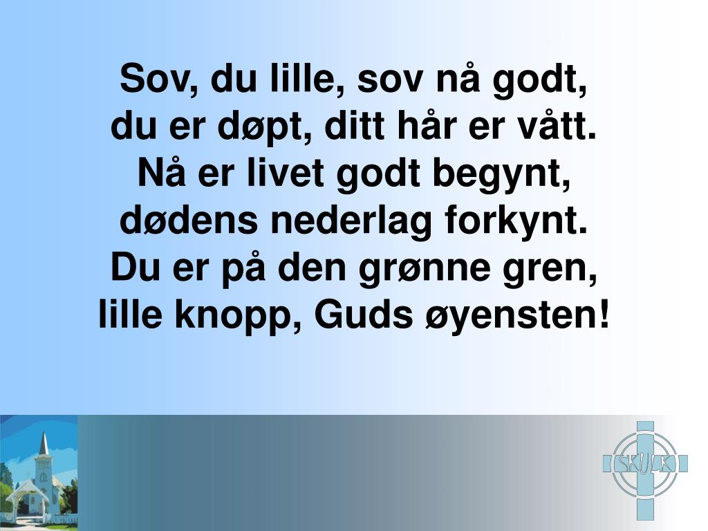 Sov, du lille, sov nå godt, du er døpt, ditt hår er vått. Nå er livet godt begynt, dødens nederlag forkynt. Du er på den grønne gren, lille knopp, Guds øyensten!