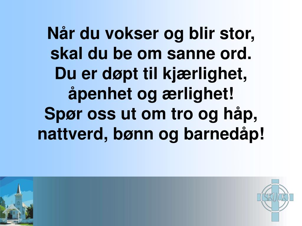 Når du vokser og blir stor, skal du be om sanne ord. Du er døpt til kjærlighet, åpenhet og ærlighet! Spør oss ut om tro og håp, nattverd, bønn og barnedåp!