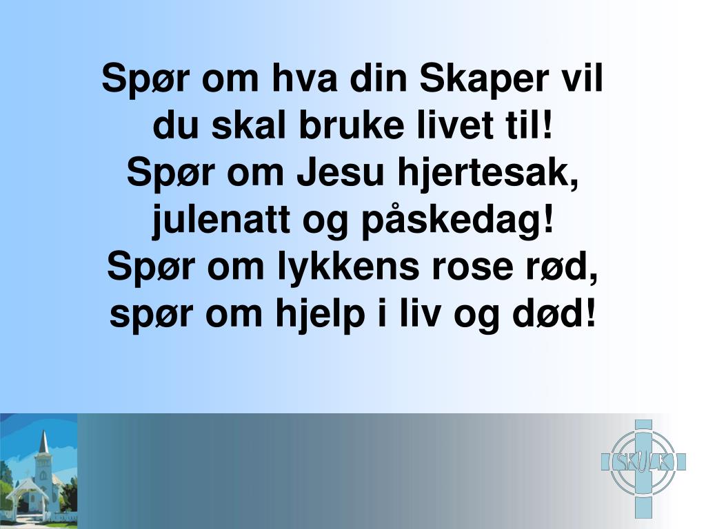 Spør om hva din Skaper vil du skal bruke livet til! Spør om Jesu hjertesak, julenatt og påskedag! Spør om lykkens rose rød, spør om hjelp i liv og død!