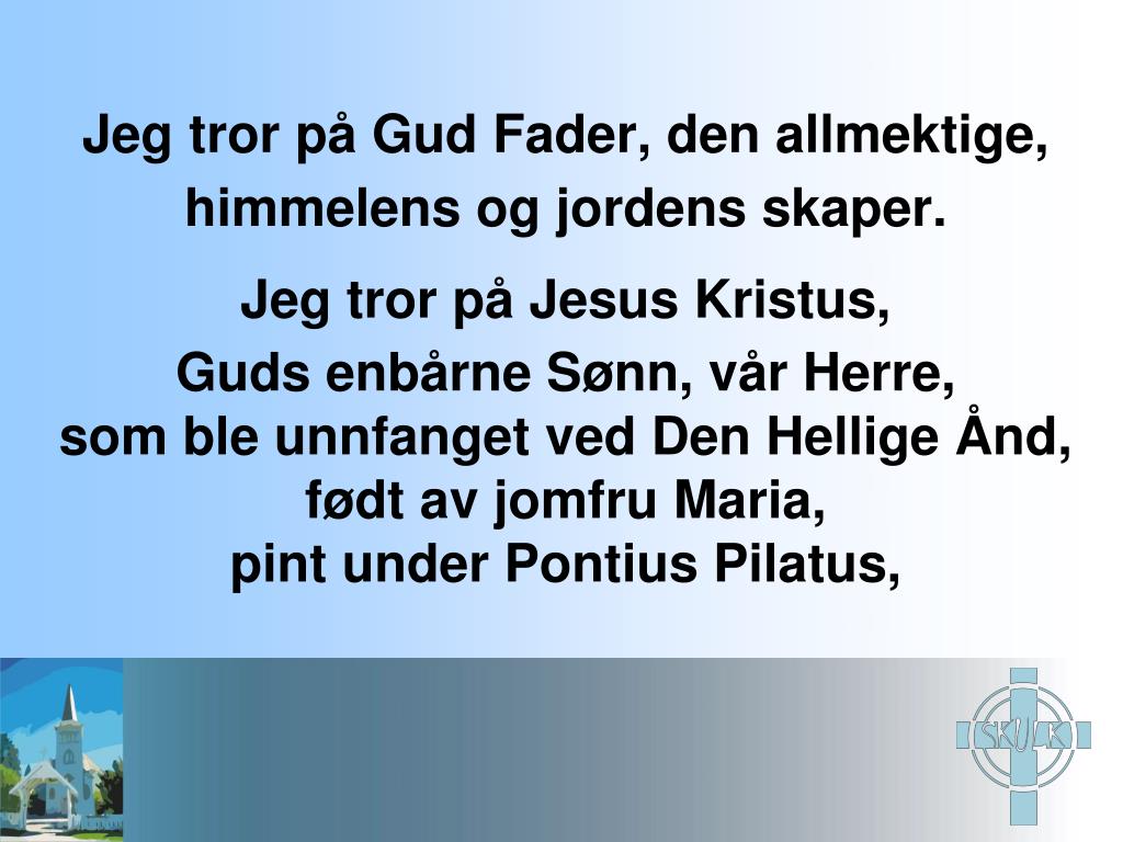 Jegtror på Gud Fader, den allmektige, himmelens og jordens skaper. Jeg tror på Jesus Kristus, Guds enbårne Sønn, vår Herre,som ble unnfanget ved Den Hellige Ånd,født av jomfru Maria,pint under Pontius Pilatus,