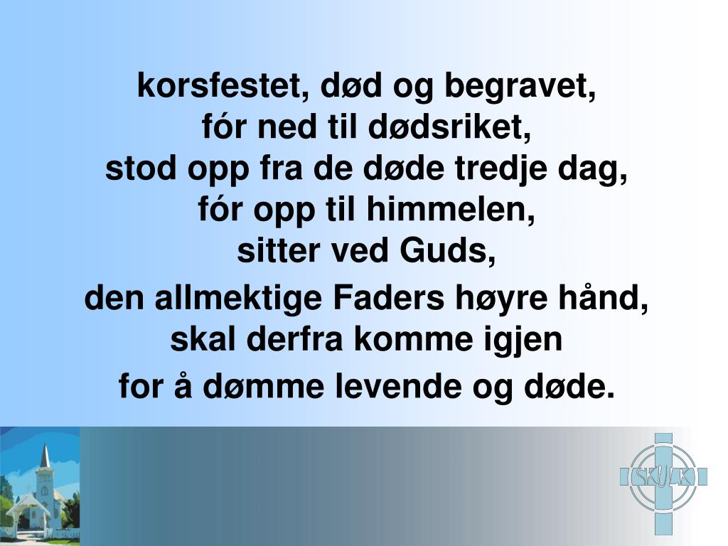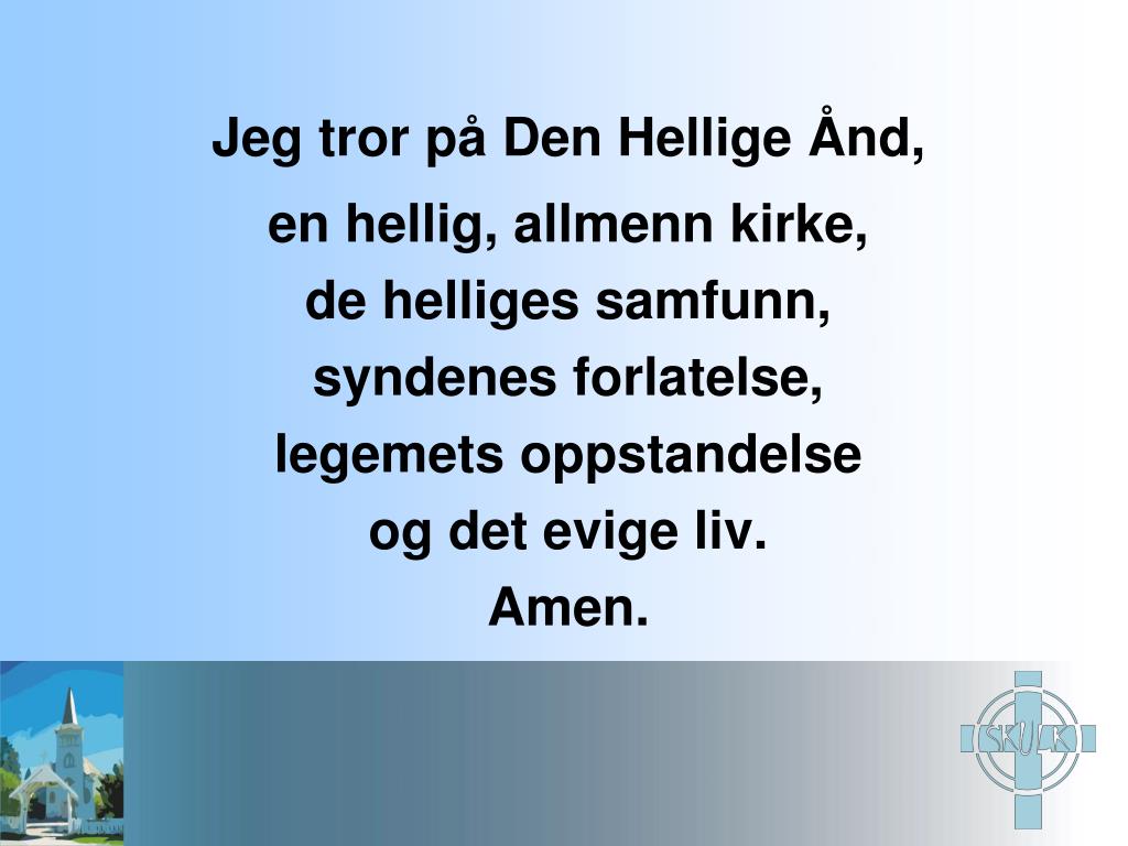 Jeg tror på Den Hellige Ånd, en hellig, allmenn kirke,de helliges samfunn,syndenes forlatelse,legemets oppstandelseog det evige liv.Amen.