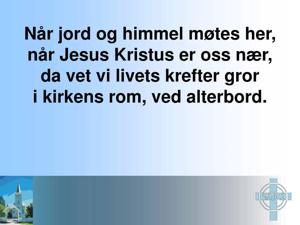 Når jord og himmel møtes her, når Jesus Kristus er oss nær, da vet vi livets krefter gror i kirkens rom, ved alterbord.