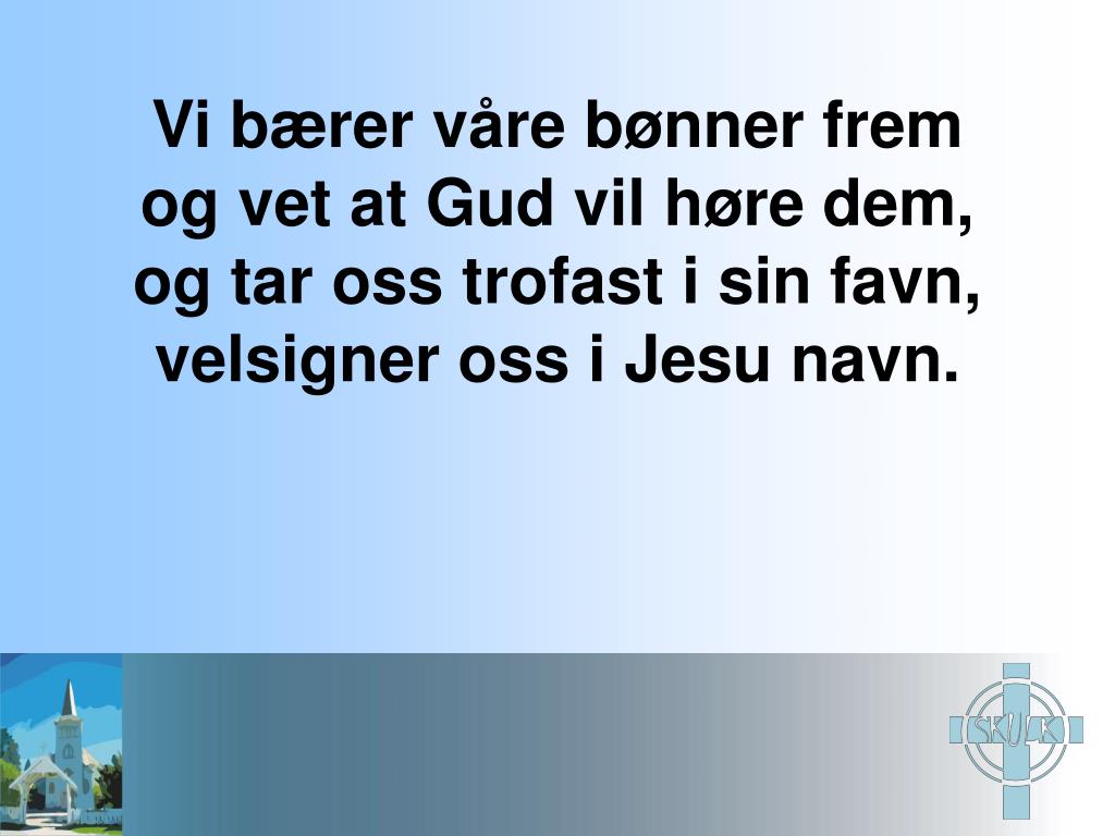 Vi bærer våre bønner frem og vet at Gud vil høre dem, og tar oss trofast i sin favn, velsigner oss i Jesu navn.