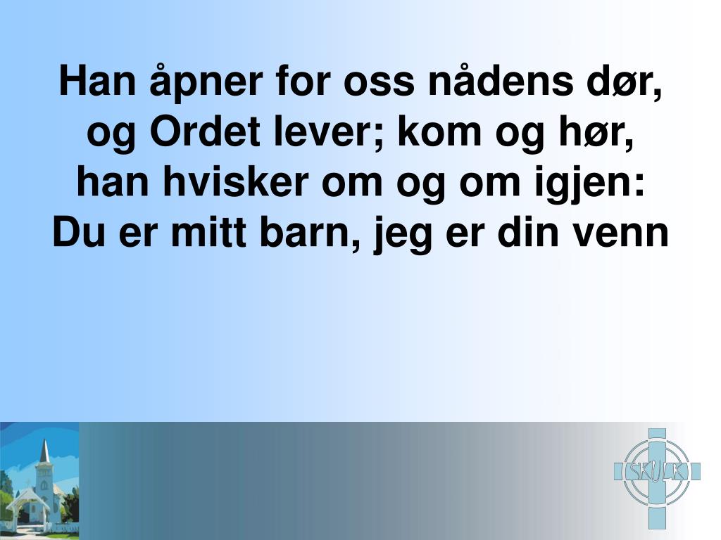 Han åpner for oss nådens dør, og Ordet lever; kom og hør, han hvisker om og om igjen: Du er mitt barn, jeg er din venn